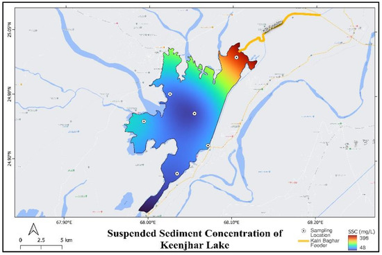 The map in Figure 6 correlates with the drainage pattern of the study area presented in Figure 1. The highest SSC is at the KB Feeder inlet, an unlined canal-feeding the lake that is the most dominant source of sediment in the lake. Runoff does not play a major part in sediment delivery to the lake due to the presence of protection wall along the major portion of the western boundary of the lake.