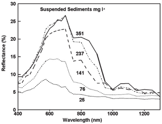 Although the results were validated from the samples’ data, the data were not allowed to be published due to the confidentiality of the report. Moreover, the open-source SSC data for the lake were unavailable. Hence, the results were calibrated and validated with the help of previous studies using the established and tested relationships of SSC and reflectance for the estimation of concentration values. The suspended sediment concentration for different surface reflectance values in different ranges of spectrum wavelengths was calculated and compared by at least five different established relations. Jerry C. Ritchie [3] established a relationship between the wavelength of the light reflected and the percentage reflectance for various SSC as shown in Figure 7.