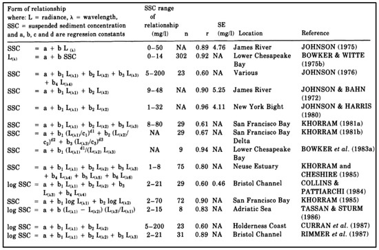 Ritchie [3] also compiled several relationships between SSC and wavelengths from the literature shown in Figure 8. Some of these equations were used for calibration and validation.