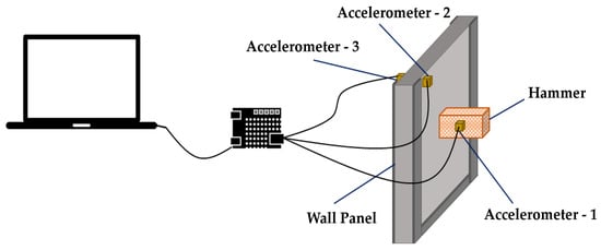 For wall panels, failure stages were predefined to obtain dynamic properties at intervals during the application of impact loading. A 2.925 kg hammer was used to perform impact strikes on a three-edge supported wall panel, in a modified pendulum impact apparatus. Damage produced or penetration of the wall panel above 25 mm was defined as the failure stage. Accelerometers at three different locations (at the hammer, at the top right corner of the impact-facing side of the wall, and another one across the panel at the same location) were used to assess the variation of impact energy dissipation as shown in Figure 1.