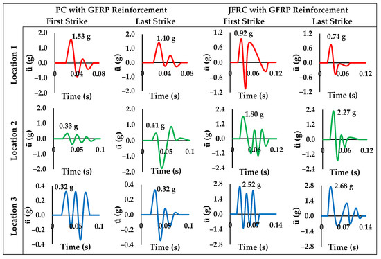 The damaged specimens show a noticeable portion of concrete spelled out GFRP reinforced PC and fibers emerging out of the concrete in GFRP reinforced JFRC. Figure 2 shows the recorded accelerations at the first and last hammer. The comparison is made to show the acceleration or energy transfer through a specimen with an intact internal structure to one with disturbed internal structure due to impact strikes. It is evident from the acceleration time graphs of location 2 and 3 that the wave propagation time of JFRC is greater than that of PC because of the damping induced due to the addition of jute fibers. Furthermore, there is significant increment in recorded acceleration as the effect progresses from location 1 to location 3.