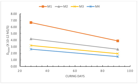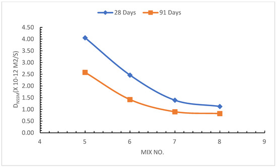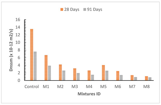 Chloride migration coefficient (Dnssm) of all mixes at 28, 90 days curing period.