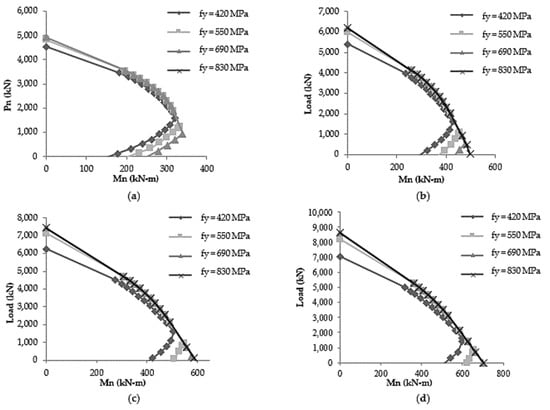 Effect of the yield strength of a steel rebar on the (a) axial load, (b) pure bending moment, (c) balance load, and (d) balance moment of a 450 × 450 mm column at a 21 MPa concrete compressive strength.