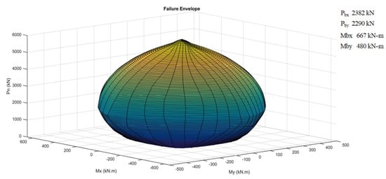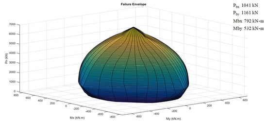 Three-dimensional load–moment interaction failure surface for a 450 × 600 mm column cross section corresponding to a 1% reinforcement ratio and a 21 MPa concrete compressive strength at a yield strength of 830 MPa.
