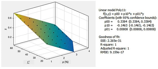 - A multivariable regression, as shown in Figure 6, is performed on the Z factor, concrete compressive strength, and reinforcement ratio to obtain Equation (1):where is the concrete compressive strength (MPa), while is the reinforcement ratio (%).