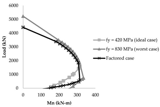 - A balance load is selected at yield strength values of 420 MPa (ideal case) and 830 MPa (worst case) from the load–moment interaction diagrams at all concrete compressive strength values (20–60 MPa) for a reinforcement ratio ranging from 1% to 4%.