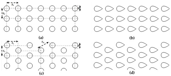 The design specifications and operating parameters for the flow across banks of tubes (circular and aero) with aligned and staggered arrangements are given here. Normally, a fluid flows over the tubes with another fluid flowing inside at a different temperature. These tube rows are arranged either in an aligned or staggered configuration with an axis normal to flow. The 2-D geometrical representation of these arrangements is shown in Figure 1. Both aligned and staggered configurations are characterized by the transverse pitch , diagonal pitches , and longitudinal pitch measured between the tube centers. The maximum thickness of the NACA airfoil or aero tube is equal to the circular tube diameter, while the transverse and longitudinal pitches are the same for both cases, as shown in Figure 1. The fluid enters the bank with a certain value of velocity (range: 6–21 m/s) and inlet temperature (288 K) and moves over the tubes with a surface temperature (343 K) and the phenomena of momentum and energy transport take place inside the bank. The flow conditions inside the bank are dominated by the wake interactions and the boundary layer separation effects which affect the convection heat transfer. Therefore, the rate of convection heat transfer and pressure drop are evaluated here for each configuration.