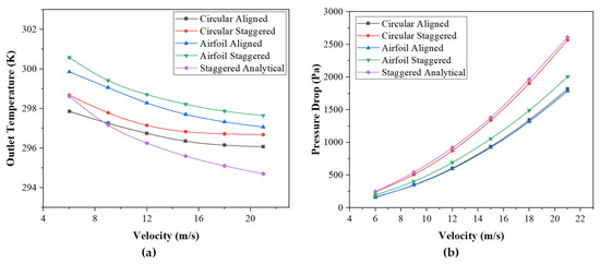 Figure 2a shows the variation in the weighted average temperature at the outlet as a function of the velocity of air. The maximum temperature is observed in the case of airfoil tubes in a staggered arrangement, and the minimum in the case of circular tubes in the aligned arrangement. The outlet temperature decreases by increasing the velocity because the contact time for convection heat transfer decreases inside the bank. Therefore, momentum diffusivity dominates the thermal diffusivity by increasing the velocity of fluid.