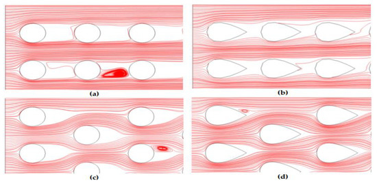 Streamlines around (a) circular aligned, (b) airfoil aligned, (c) circular staggered, and (d) airfoil staggered.