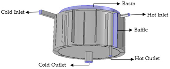 The 3D computational model of GWVHE used in the present study is shown in Figure 1. The height and diameter of the basin are 380 mm and 700 mm, respectively. There are two fluid domains separated by a solid domain. In both fluid domains, the fluid is water. The outer cylinder with baffles contains hot water, while the central basin cylinder has cold water. The solid domain is assumed to be made of steel. To effectively induce the gravitational effect, the top interface of the basin cylinder remains open to the atmosphere. Steady state heat transfer analysis of the GWVHE is performed using COMSOL-Multiphysics (V 6.0) and a user control mesh is applied on each domain to discretize the geometric model.