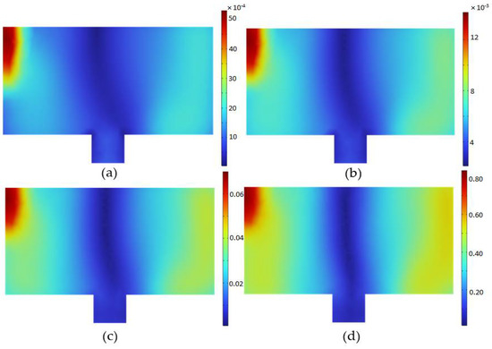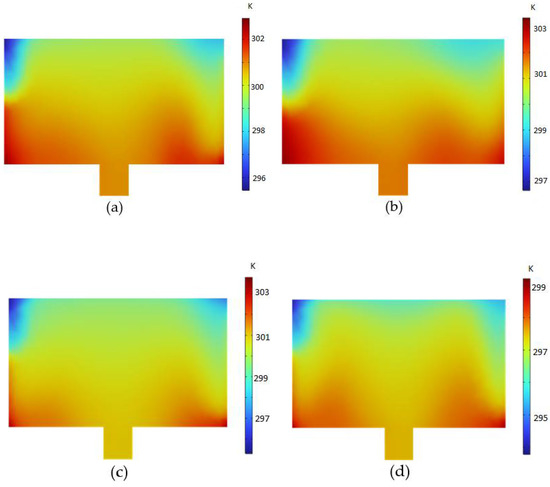 Figure 3a–d show the temperature distributions of the cold fluid domain at constant inlet mass flow of the hot domain, which represent the temperature gradient at the mid-section of the basin. It is observed from the simulation analysis that the highest temperature gradient is obtained at the lowest inlet mass flow rate of 0.005 kg/s. This shows that the time of contact between both fluids is very important to exchange energy.