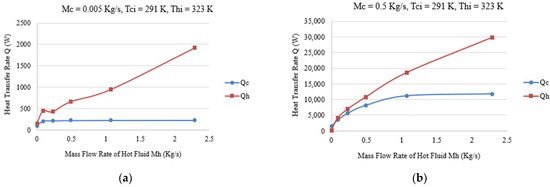 Figure 4a,b show the energy balance comparison of both fluid streams with (0.005 kg/s to 0.5 kg/s) the inlet mass flow rate of the cold domain. However, the inlet mass flow of the hot domain varies from 0.002 kg/s to 2.29 kg/s. It can be observed that at the smaller flow rates of both domains, the thermal losses are less but as the hot side inlet mass flow rate increases, the energy losses to the environment are increased.