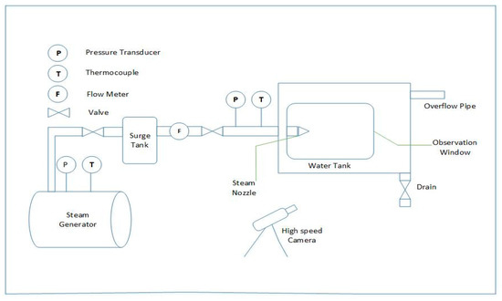 The experimental setup, shown in Figure 1, was designed to provide saturated steam injection in subcooled water. The electric boiler could provide 52 kg/h of steam (~99% quality), at a maximum pressure of 8 bar. The electric boiler was a cylindrical tank containing four electric heaters (9 kW capacity of one heater) submerged in water. Steam cavity was captured using a high-speed camera and processed using a MATLAB code. The operating conditions and nozzle dimensions are given in Table 1.