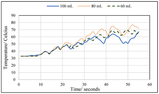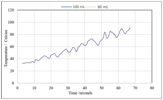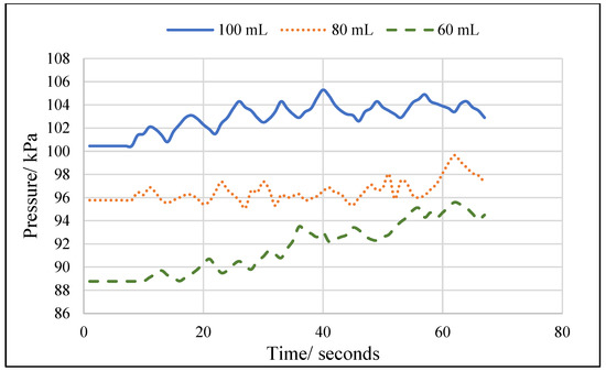 In order to analyze how an engine’s working liquid volume affects performance, tests were carried out with volume of the working liquid (water) varied as 100 mL and 80 mL. The effects of the varied volumes were studied with respect to oscillations amplitude and stability, pressure and temperature variations in the cold end, and the pumping power at that volume was found. Vernier temperature and pressure sensors were used to record these values, which are illustrated in Figure 4 and Figure 5.
