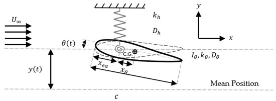 An airfoil able to move in pitching and heaving degrees of freedom is placed on a pivot point passing through the pitching axis (Figure 1). The equations of motion [5] for such an airfoil can be given as (Equations (1) and (2)):