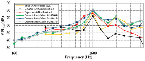 In order to validate the model, the coefficients of lift, drag and sound pressure levels were compared (Table 1) with those stated by experimental [7] and numerical setups [8,9]. Lastly, the sound pressure level in the one-third octave bands (SPL1/3) were established and further related with the validation cases along with the mesh convergence study (Figure 2). The current model replicated the position of the main tone (~1.6 kHz) and sound pressure level (75 dB), which was in perfect harmony with the published data [7,10,11].