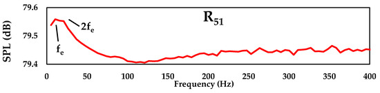 Frequency configuration of SPL about the flapping hydrofoil at one of the receiver locations in the middle circle.