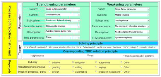 After the description of technical problems is completed, the system matches the description content with the general engineering parameters in the classical conflict matrix and then gives the corresponding innovative solution principle, as shown in Figure 4. The contradiction parameters obtained by the problem description system are: improving the ‘shape’ and deteriorating the ‘complexity of the system’. Then, corresponding to the classical process conflict matrix, the invention principle is: invention principle 16 (insufficient or excessive action), invention principle 29 (pressure and hydraulic structure), 1 (segmentation), and invention principle 28 (mechanical system replacement). After analyzing the original understanding, the designers obtain the corresponding inspiration.