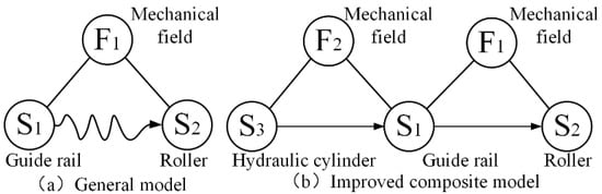 A new problem appears after the guide rail is segmented: the guide rail in the processing area needs to increase its strength, but at the same time, the reinforced guide rail is still directly affected by the working force, so this problem has not been completely solved. Establish a field model as shown in Figure 5a. Using the standard solution, since this problem belongs to the harmful effect model, a complex field model is constructed by considering the guide rail structure at the machining position, as shown in Figure 5b. Since the guide rail needs to bear a strong role, the guide rail below the roller in the processing area is replaced by the hydraulic cylinder structure. In addition, in order to facilitate the movement of the roller, inspired by the movement scheme one, the upper end face of the piston rod can be machined into a channel to facilitate the movement of the roller.