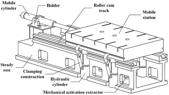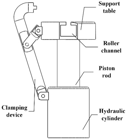 Therefore, the design results not only meet the mobile needs of the workbench but also use the hydraulic cylinder as the support structure to facilitate the installation and save space. The structure can completely avoid the bearing force of the guide rail and the roller. Finally, the structural complexity of the whole system is also reduced by fixing the workbench through the linkage mechanism in the process of fetching. Its structure is shown in Figure 8.