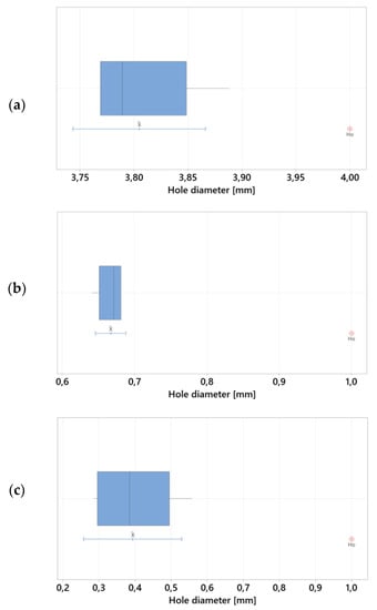 t-tests are carried out for the lowest error (hole with nominal diameter of 4 mm, printing speed of 80 mm/s and layer height of 0.1 mm—error: 5%), for a medium error (nominal diameter: 1 mm, printing speed: 50 mm/s, layer height: 0.1 mm—error: 33%) and for the highest error (nominal diameter: 1 mm, printing speed: 80 mm/s, layer height: 0.1 mm—error: 61%). The results of these tests are given in