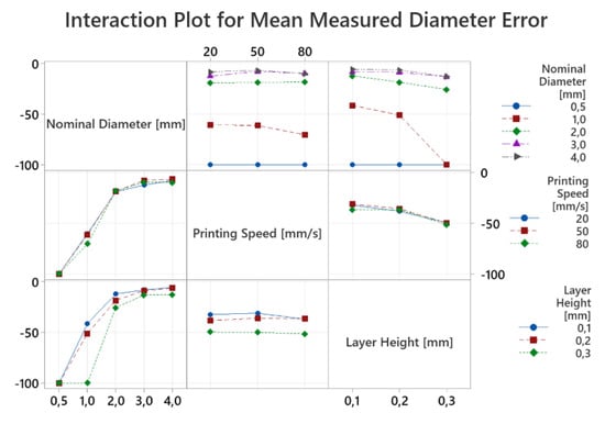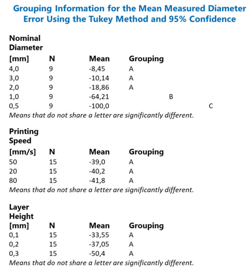 Figure 5). According to the Tukey tests, no significant difference is shown for different printing speeds and layer heights. On the other hand, significant differences are observed for different nominal diameters. Specifically, 0.5 mm and 1 mm nominal diameters significantly differ from the 2 mm, 3 mm and 4 mm nominal diameters. This means that one calibration is enough to print for all the different printing speeds and layer heights for the nominal diameters of 2 mm, 3 mm and 4 mm with very good accuracy. On the other hand, different calibrations will be needed to print the 0.5 mm and 1 mm nominal diameters. Nevertheless, as the mean measured diameter errors for the 0.5 mm and 1 mm nominal diameters are very high, it is advisable not to use the current 3D printer for nominal diameters below 2 mm. For the 0.5 mm and 1 mm nominal diameters, it is advisable to use a more advanced 3D printer.