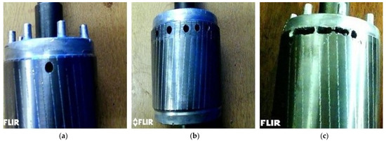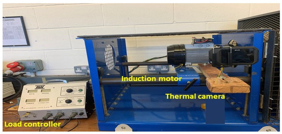An FLIR thermal camera was used to capture thermal images, and it was positioned appropriately on the test rig a certain distance away from the induction motor center, as shown on the test rig. Several camera locations were tried before the final one was selected, considering the quality of each one factored. Thermal images were captured at two speeds after the engine had run for 15 min, and then, the images were stored in JPEG format with a pixel size of 320 × 240, as displayed in Figure 5.