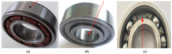 Artificial bearing faults: (a) outer bearing fault, (b) inner bearing fault, and (c) ball bearing fault.