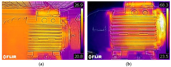 Thermal images: (a) healthy motor run at a speed of 1480 rpm and (b) the motor has an inner bearing fault and run at a speed of 1380 rpm.