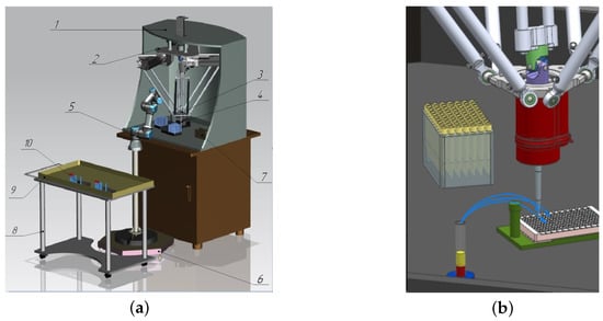 (a) A 3D model of the robotic system: 1—body, 2—DeLi manipulator, 3—dispensing head, 4—dispenser tip, 5—robot manipulator, 6—base of the robot manipulator, 7—workspace, 8—rack with test tubes, 9—tray for consumables, 10—trolley; (b) execution process of aliquoting robot DeLi.