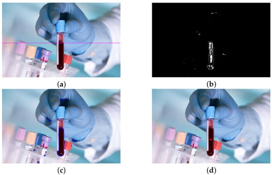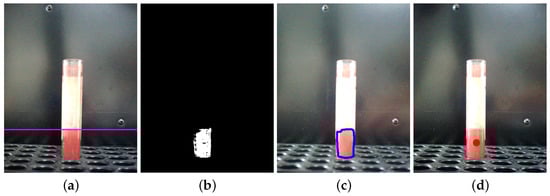 Results of the recognition of a sample of tinted water: (a) highlighting the upper border of the sample with a line; (b) binary image of the sample; (c) highlighting the sample with a contour; (d) marking the volume of tinted water with a dot.