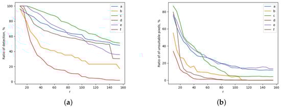 Results of the recognition of a sample of tinted water: (a) dependence of the proportion of the recognized area; (b) ratio of the number of pixels that were erroneously recognized.