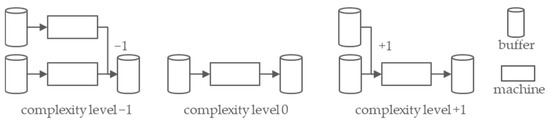 For this reason, the complexity of these two factors is varied for this study using simulation. For system configuration, machine redundancies and combinations of intermediate products are used. In order to make different systems comparable, a production line without branches was defined to have a complexity level of 0. For each linkage by redundancy, one complexity level is subtracted; for each linkage by combination, one level is added. The principle is shown in Figure 1.