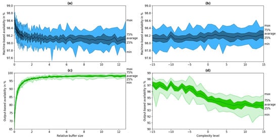 The simulation results for the two key figures, machine-based availability (blue) and output-based availability (green), are shown in Figure 2. Figure 2a,c shows the two availability values for different relative buffer sizes of a production system with a complexity level of 0. The distribution and variance of the 30 simulation runs for each combination are indicated by the filled-in area. The machine-based availability initially drops from 98.6% to 98.1% as the relative buffer size increases and stays more or less constant from two to the maximum. Output-based availability, on the other hand, rises sharply from an initial 70% until it reaches about 98.1% availability at about a relative buffer size of six and one-half. For larger buffer sizes, it behaves like machine-based availability and continues at a constant level.