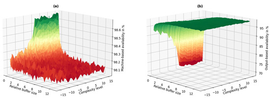 (a) Machine-based availability and (b) output-based availability over relative buffer size and complexity level.