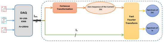 The signal processing method quantitatively analyzes the characteristics of a specific motor signal or conducts an observation of specific harmonics, as in [5,6]. The analysis of the current and voltage signals is obtained from the motor, or the application of the fast Fourier transform (FFT) is performed to obtain a spectrum that varies according to the operating conditions of the motor.