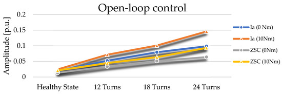 The experimental results performed with open-loop control are represented in Table 2, which shows the quantitative evaluation of the FFT of the indicators studied. These tests were performed for different scenarios of different severities and loads. As it is possible to observe, the third harmonic of current and indicator (ZSC) clearly demonstrates the evolution of the fault for different loads, as not being affected by load variation.