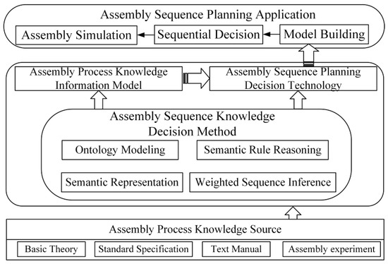 Therefore, this paper first establishes an ontology-based assembly semantic process knowledge model and proposes an assembly semantic process knowledge information model covering sub-assembly-level semantic information. Second, the assembly sequence planning ontology model was constructed in Protégé, and based on the part assembly constraint rules, feature coordination constraint rules and assembly priority rules, an iterative revision assembly sequence process based on semantic rules was designed. Finally, the application and verification of the construction method of the assembly semantic process knowledge information model and the assembly sequence planning decision technology based on the semantic process knowledge were carried out. The product assembly sequence planning process based on semantic process knowledge proposed in this paper is shown in Figure 1.