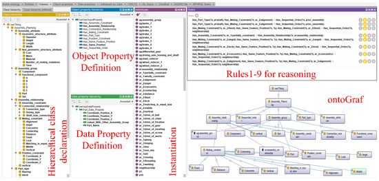 According to the seven-step method of ontology construction that defines the assembly sequence planning ontology object attributes and data attributes, the model in Protégé is shown in Figure 2.