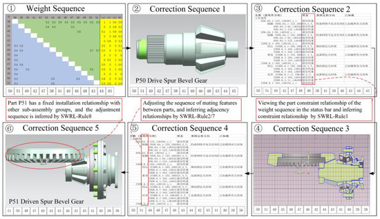 Figure 4 shows the weight sequence inference correction process of the atypical structure sub-assembly main reducer of the drive axle of construction machinery. Among them, part ➀ shows the summary table of the weight sequence of each part of the main reducer. Part ➁ shows that it is checked that part P50 is a shafting part, which can be used as a reference part to maintain the original weight sequence. Part ➂ shows the status bar in the table. There is a constraint relationship between the middle parts inferred from Rule 1 in the inference engine. P39 and P38 have a constraint relationship, and sequence 1 does not contain P39, inserting P39 into the current sequence to generate sequence 2. Part ➃ shows the spatial position coordinates of each part of the main reducer assembly group, and sequence 3 is generated. Part ➄ shows that it is checked whether the adjacent parts have the assembly matching feature style in the red frame line. The adjacent relationship between the parts is obtained by reasoning. Sequence 4 is the new sequence after adjustment. Part ➅ shows that it is checked that the part P51-driven spur bevel gear and the parts not in this assembly group have a preferential fixed installation relationship. The inference engine has a fixed installation relationship. The special assembly relationship of P51 is obtained by inference in Rule 8, and P51 is adjusted to the first position of the sequence to generate sequence 5.