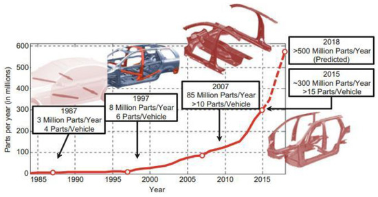 The growing popularity of hot stamping over time (complexity of parts and production volume) [1].
