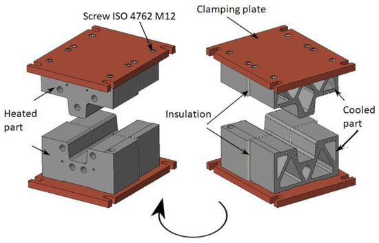Afterward, the printed parts were cut off from the platform and taken to the machining site where the final functional surface was milled, threads were cut, etc. This was followed by the assembly of all the parts onto the clamping plates, thus maintaining the relative position of the cooled and heated parts of the tool throughout the press-hardening process. First, the heated parts of the tool (heavier because they are solid) were clamped with the final surface condition already milled. In addition, grooves were cut into the heated tool parts to place thermocouples for subsequent measurement of the temperature distribution during the process itself. These grooves were milled to a depth such that the thermocouples were at a sufficient depth below the surface to measure the prescribed requirements. The thermocouples were K-type insulated thermocouples with a diameter of 1.5 mm. Insulating plates made of PAMITHERM 41130 thermally insulating laminate material were attached to the edge that would subsequently be connected to the cooled part of the tool. The printed parts of the tool were then attached.
