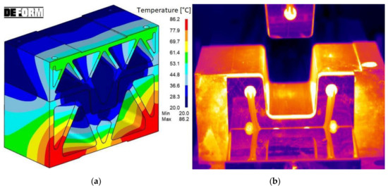 An example of one of the simulations of heat conduction to the cooled half of the tool through the clamping plate is shown in Figure 6. It can be seen that, due to the printed structure of the tool, heating reached a maximum of 86.2 °C in the lower part of the tool, while the temperature remained around 20 °C in the area intended for forming. This phenomenon was also measured during the testing. The temperatures measured by a thermal camera differed from the simulation by a maximum of 8%.
