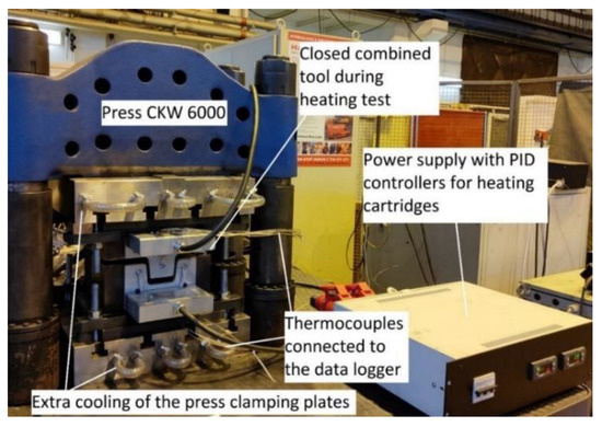 Figure 7 shows the complete tool set-up including accessories at the workplace of the CKW 6000 hydraulic forging press. The combined tool is shown in the picture from the side where the heating took place. On this side were the boxes in which the supply line from the power supply was connected to the individual heating cartridges. Thermocouples were then routed from this side to the data logger for measuring temperatures during the operation. The power source with PID controllers and a diagram of the thermocouple locations can also be seen. Only the cooling in the clamping plate of the press is seen here to avoid overheating the device.