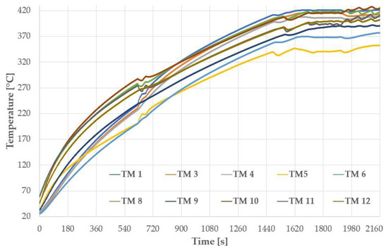The result of the functional tests and parameter tuning was a graph obtained by the thermocouples which recorded the heating of the tool (Figure 8). The graph shows the recordings from thermocouples TM 1, 3, 5, and 6 for the upper part of the tool and TM 8, 9, 10, 11, and 12 for the lower part of the tool. Thermocouples 2 and 7 were fed to a power supply with PID controllers and used to reheat the tool (switching the heating on and off) if necessary. This effect is visible on the graph at a time of about 2000 s, where the waveforms are visible due to the switching. From the measurements, it can be said that heating to a tool temperature of 425 °C takes approximately 30 min.