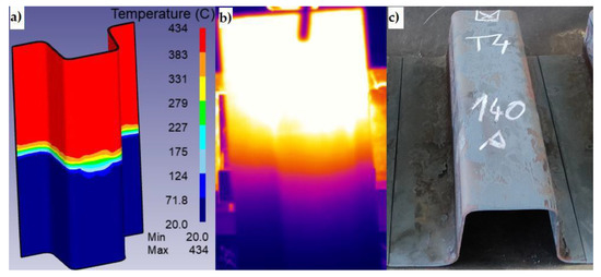 Figure 9 shows the difference in the temperature distribution between the simulation and the experiment. The width of the transition area depends on the dwell time of the sheet in the combined tool. Figure 9a shows an optimum variant of the temperature distribution in DEFORM after a dwell time of 60 s in the tool, and Figure 9b shows an image from a thermal camera with temperatures from 20 °C to approximately 425 °C with the same dwell time. The first experiments showed that it is possible to produce omega profiles without visible defects with a different temperature field distribution along the length of the sheet, as seen in Figure 9c.