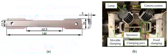 (a) Geometry of the tensile specimens. (b) Experimental setup of the thermo-mechanical simulator Gleeble 3500.