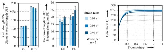 For the transformation of the T6 state into W-temper condition, the tensile specimens were solution annealed at 460 °C for 10 min and quenched in water followed by natural aging for 45 min. It was intended to examine three different strain rates: 0.01 s−1, 0.1 s−1, and 1.0 s−1. However, as the tests were not strain rate controlled, acceleration effects in the experiment led to deviations from the planned strain rates. Due to this, the strain rates were averaged to 0.01 s−1, 0.08 s−1 and 0.90 s−1 to establish a strain rate dependent material model. The corresponding mechanical properties and the extrapolated flow curves are shown in Figure 2. In the context of earlier investigations, significantly lower strength and increased elongations were detected for the W-temper condition compared to the initial T6 state []. The tensile strength decreases slightly with increasing strain rates in W-temper condition, while yield strength and elongation at break tend to be constant or slightly increasing. Thus, the material shows a negative strain rate sensitivity in the range of strain rates investigated, which could be explained by the PLC effect []. Higher strain rates consequently lead to lower strength.