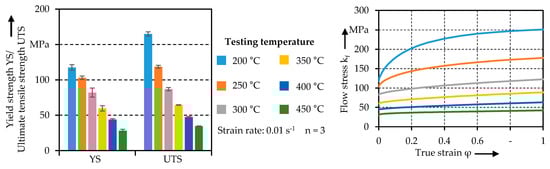 To characterize the hot forming route, the tensile specimens were first solution annealed and quenched according to the W-Temper route and then isothermally tested at temperatures between 200 °C and 450 °C. The temperature of 450 °C corresponds to the forming start temperature after the tube transfer from the furnace to the forming die and closing of the tool. Three strain rates between 0.01 s−1 and 1.00 s−1 were investigated for each temperature. To avoid an uneven temperature distribution due to the conductive heat input, the mechanical properties were only evaluated over a width of 3 mm and not over the full testing length of 50 mm. Therefore, the strains are not shown as they cannot be compared with the cold tensile tests performed to characterize the material behavior in W-temper forming. The temperature-dependent strength and yield curves are shown for a strain rate of 0.01 s−1 in Figure 3.