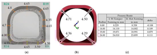 After completing the forming process, 3D coordinate measurement was carried out. The comparison between the experiment and simulation result considering the overall shape of the component and the resulting local wall thickness is shown in Figure 6. Due to the very similar results in both process routes, only one representative component was analyzed, which was produced with W-Temper forming. Figure 6a shows the cross section in the square area of the component. Starting from a wall thickness of 5 mm, obviously significant thinning occurred over the entire cross-section. The flat flank areas contact the tool first, which is why thinning is comparatively low and homogeneous in these areas. Precisely, it varies between 4.65 mm to 4.7 mm. Maximum thinning occurred in the transition area between flank and radius. Corresponding to the largest strains in the area R8, the thinning in the transition area to the flank between R8 and R14 is also the highest with approximately 28% to 3.59 mm. In comparison, Figure 6b shows the predicted thinning from the simulation. It shows that in the radii areas the predicted wall thickness deviates only slightly in the tenth of a millimeter range from the real wall thickness, which indicates a very good prediction accuracy.